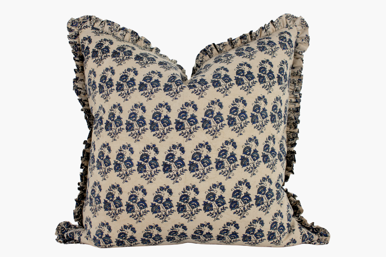 Ruffle Edge Indian Block Print Pillow Cover – Sandy Beige and Indigo
